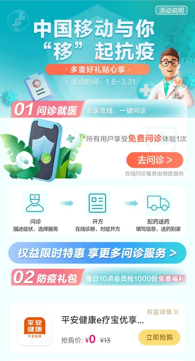 一直以来,中国移动APP都致力于为用户提供贴心温暖的服务。在以上专项服务之外,权益超市推出了健康权益包优惠购专项活动,携手权益方带来多款健康专项权益,涵盖问诊、挂号、24小时在线医疗咨询服务等,权益超市用户访问页面均可获得一次免费线上问诊机会,满足用户特殊时期的问诊需求。