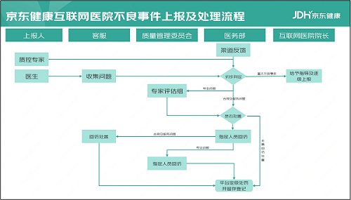 以《京东健康互联网医院不良事件上报及处理流程》为例,该流程从合规、专业及服务三个方面定义及评判不良事件,根据事件的严重程度对事件进行分级,并且规范了上报流程、处置流程,响应及处理时效等要求,有助于为不良事件的上报及处理提供有效的处理依据,保障医疗安全。