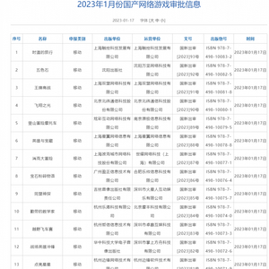 1月17日,国家新闻出版署官网发布《2023年1月份国产网络游戏审批信息》。根据披露信息,此次共有88款游戏获批,其中包括3款客户端游戏、1款Switch游戏、5款移动兼客户端游戏,剩余79款均为移动游戏。