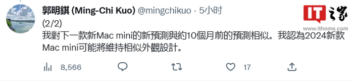此外,郭明錤称 2024 新款 Mac mini 将保持与目前版本相似的外观设计,看来此前爆料的玻璃顶盖 Mac mini 短期可能不会有了,IT之家小伙伴们可以放低期待。