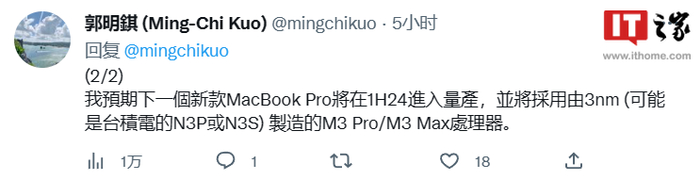郭明錤:2024 款 MacBook Pro 将配备 3nm M3 Pro 和 M3 Max 芯片