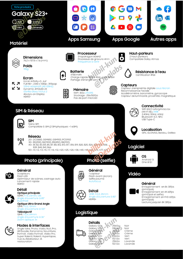 爆料人 Bilibilikun 放出了三星 Galaxy S23 系列三款机型的完整规格图,接下来我们一起看一下。