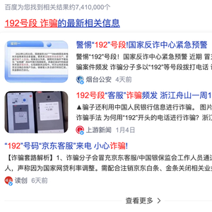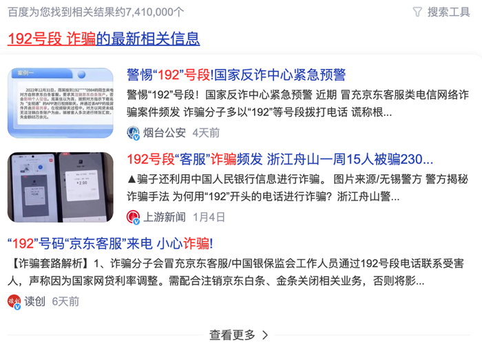 此外,大量地方网警部门通过短信或发布公告等形式,提示用户“谨防192号段冒充京东客服诈骗”。进入2023年后,主流媒体也关注到这一现象,可以看到不少相关的报道。截止发稿,通过百度搜索相关关键词,结果高达741万个!