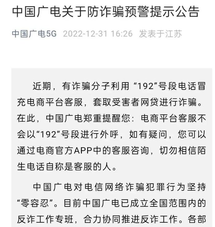 但作为192号段的运营者,中国广电绝不能坐视不理,必须担负应有的责任,采取强力措施遏制192号段被用于相关诈骗的行为。笔者看到,广电已经做了一些工作:在2022年最后一天,广电通过官微郑重发布公告,提醒用户“电商平台客服不会以‘192’号段进行外呼”,并表示对电信网络诈骗犯罪行为坚持“零容忍”。目前广电已成立全国范围内的反诈工作专班,合力协同推进反诈工作。