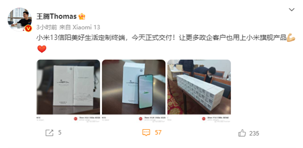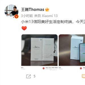 1月18日消息,小米公司河南省分公司总经理王腾发文称,小米13信阳美好生活定制终端今天正式交付,他表示“让更多政企客户也用上小米旗舰产品”。