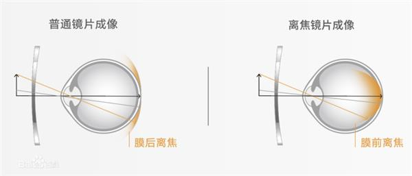 如果在视网膜中心的黄斑区,光线够不着它,构成了“近视离焦”,也称为“膜前离焦”;但在视网膜上下周边,光线又跑偏了,构成了“远视离焦”,也称为“膜后离焦”。普通的近视镜片能够有效调节中心黄斑区的光线投射位置,但视网膜上下周边还是被拉远的,就会诱导眼球往后拉伸、寻找焦点,从而导致眼轴进一步拉长,近视不断加深。