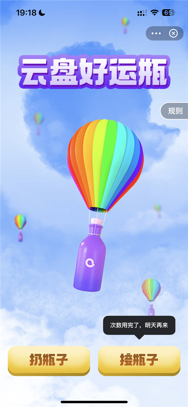 根据实测,阿里云盘新上线的“好运瓶”功能有点类似之前大家玩的“漂流瓶”,简单来说,大家可以通过该功能将自己珍藏在云盘的文件“装”在好运瓶中,然后分享出去,其他阿里云盘用户会随机接到你的好运瓶,还能将文件转存到自己的云盘中。