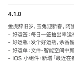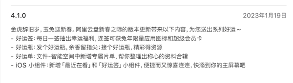 今日,号称免费、不限速的阿里云盘也推出了iOS版4.1.0新春更新,带来好运签、好运瓶、好运单三项全新内容,同时还对iOS小组件进行了更新。