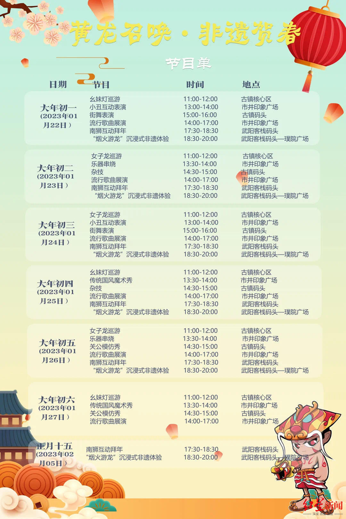 在春节和元宵期间,舞龙舞狮、幺妹儿灯、变脸吐火等多种传统民俗文化表演和流行歌手驻唱、街舞、民族舞蹈、杂技等受游客喜爱的潮流元素表演也将在古镇各个街区开展全天式巡演。