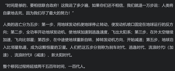 比如小说中依照地球的在发动机驱动下的运行位置,“流浪地球”计划分为刹车时代、逃逸时代、流浪时代1(加速)、流浪时代2(减速)和新太阳时代五个阶段。