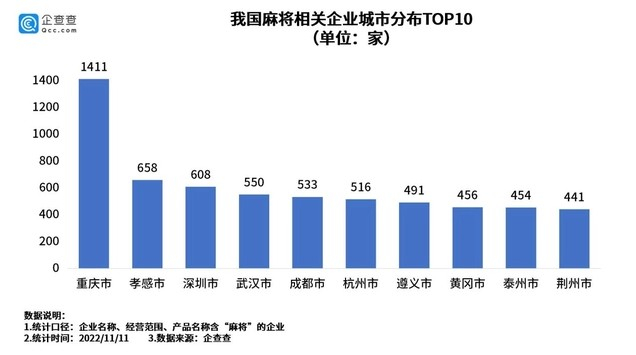 企查查数据显示,我国现存麻将相关企业3.4万家。在城市分布方面,重庆现存1411家麻将相关企业,其次是孝感现存658家,深圳现存608家。
