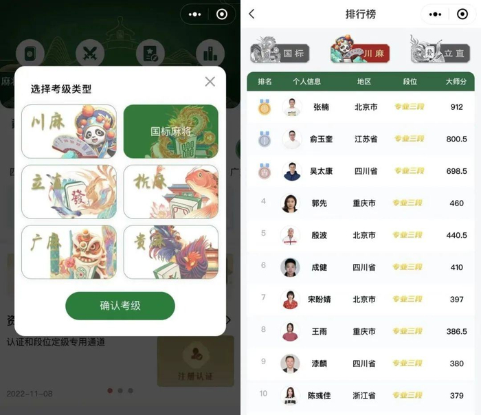 据了解,官方已开放四川麻将、国标麻将、立直麻将、杭州麻将、广东麻将、贵州麻将六大项目的考级定段。