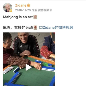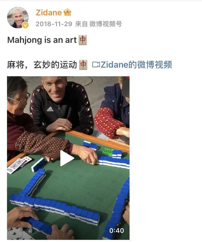 时间回到4年前,法国球星齐达内与妻子在杭州街头闲逛时偶遇搓麻将的大妈。他发微博感慨:“麻将,玄妙的运动。”