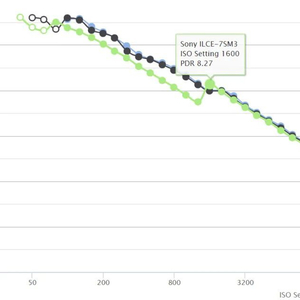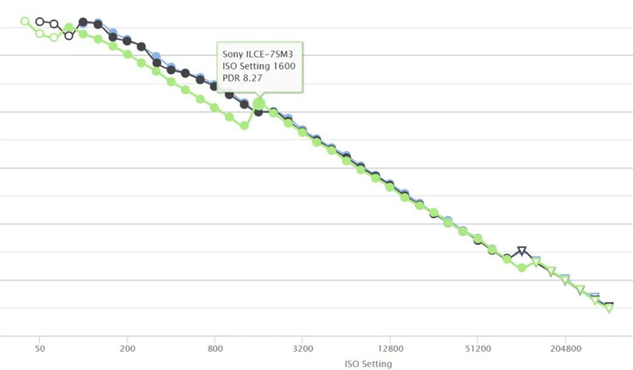 一是查询官方网站的商品详情页,二是参考 photonstophotos 等网站的动态范围点线图。以下图为例:绿色点线图(索尼 7SM3)在 ISO 1600 这里出现了一个拐点,动态范围比 ISO 800 的表现还要好。而另外两条线(索尼 7S、7SM2)没有这样的拐点,也就是只有一个“原生 ISO”。