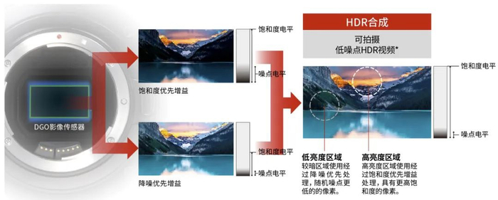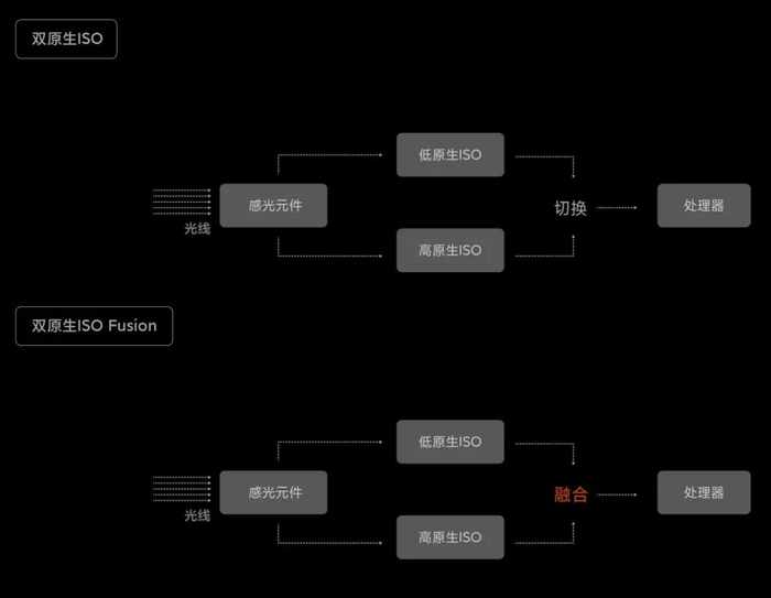 绝大多数相机、手机的“双原生 ISO”只能以“切换”模式进行工作;少数产品则能在拍摄视频时让两个原生 ISO 同时工作,通过融合实现更大的动态范围。这种做法,佳能 C 系列数字电影机上称为“双增益成像”(DGO,EOS R5 C 除外)、松下 GH6 称之为“动态范围提升”,小米 10 Ultra / 11 Ultra 则称为“双原生 ISO Fusion”。