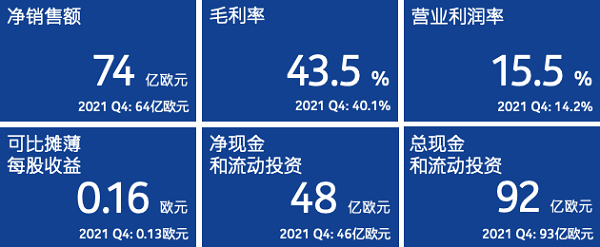 其中,2022年第四季度营业收入为74.49亿欧元,同比增长16.14%;归属于普通股东净利润为31.55亿欧元,同比增长366.72%;按固定汇率计算,第四季度净销售额同比增长11%(按国际财报准则计算16%)。