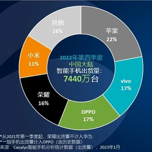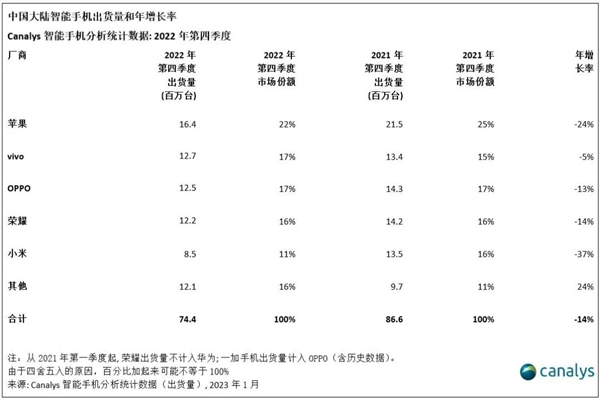 知名市调机构Canalys发布的最新报告显示,2022年第四季度,中国大陆手机市场依旧在地位在低位运行,整体出货7440万台,同比下跌14%。