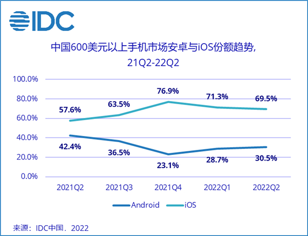 在2020年下半年开始的不可控的因素冲击下,头部安卓厂商缺席(主要是华为),而苹果在中国600美元以上高端手机市场的份额一路看涨,直到2021年末达到近3年的最高份额76.9%。2022年,头部安卓厂商市场份额开始回升至30.5%,但是与苹果差距依然较大。