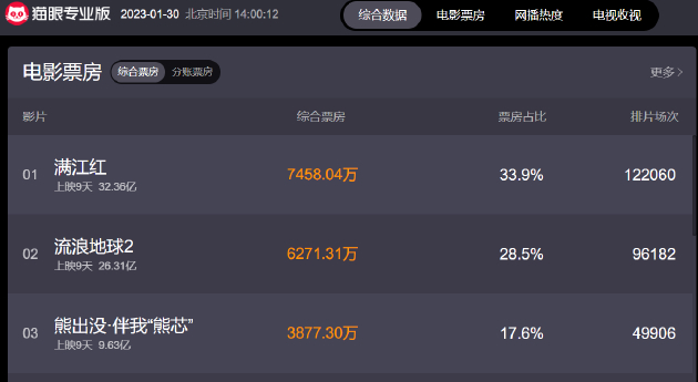 据猫眼专业版数据显示,截止1月30日下午2点,《流浪地球2》票房26.31亿,占比28.5%,位居春节档票房第二。