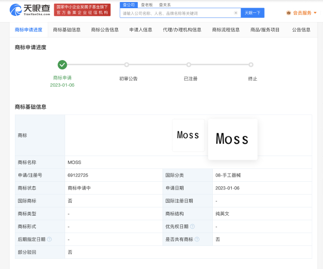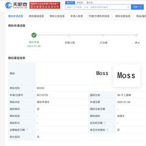 天眼查App显示,“MOSS”商标已被多方注册为商标,申请人包括科技公司、电商公司、传媒公司以及自然人许某某、谭某某等,国际分类包括科学仪器、灯具空调、运输贮藏等。最近的一枚“MOSS”商标是某科技公司申请于2023年1月,国际分类为手工器械,目前商标状态为申请中。