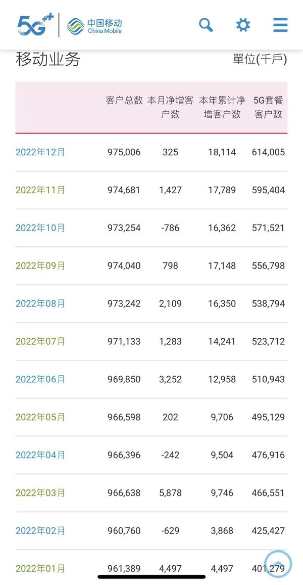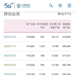 数据显示,2022年12月份,中国移动用户总数达到9.75006亿户,当月净增客户数32.5万户。