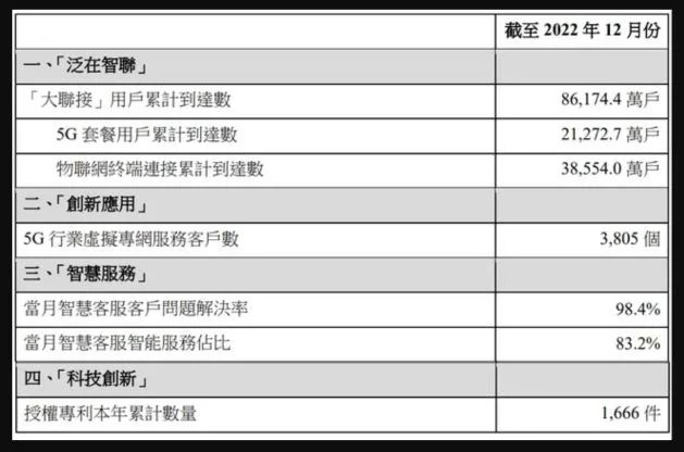 此外,截至2022年12月,中国联通5G行业虚拟专网服务客户数达到3805个,当月智慧客服客户问题解决率98.4%,当月智慧客服智能服务占比83.2%。在科技创新方面,中国联通授权专利本年累计达1666件。