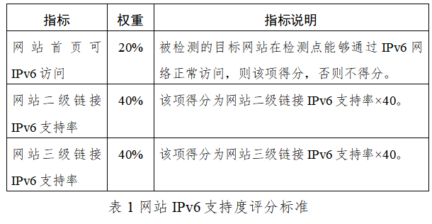 网站IPv6支持度分数根据网站首页可IPv6访问、网站二级链接IPv6支持率、网站三级链接IPv6支持率三个指标测试结果加权计算得出,得分高于90为达标,相关评定标准如表1