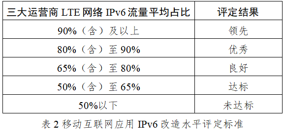 对移动互联网应用IPv6流量占比的测试覆盖中国电信中国移动中国联通等三大运营商的4G网络,测试终端为安卓系统手机,测试工具为半自动测试软件,测试结果反映用户在使用APP过程中基于IPv6的网络服务连通和流量占比情况。针对测试结果存在异常的数据,进行多轮次复测,并以稳定后的测试结果为准,相关评定标准如表2