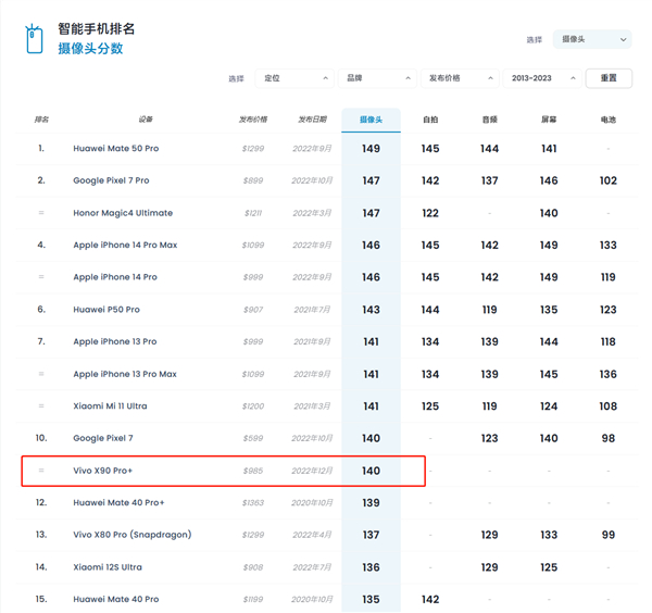 vivo X90 Pro+相机DXO得分140:一英寸大底仅排第十