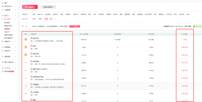 近年的露营逐渐成为热门话题,新的年度的跨度-兔年,关于2023年的关键词热度也会逐渐升高,比如近期的新年、年味、兔子等等相关话题,也可以用第三方数据调研,近期互动量较高的话题进行笔记创作。