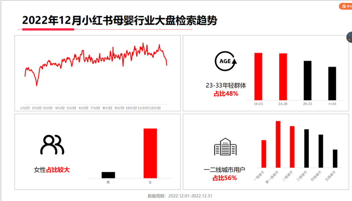 小红书母婴品类用户主体在一二线城市用户占比较高,集中在25-34岁的消费群体,当一二线城市的消费市场相对饱和之后,三线以下的城市潜力相对较大。