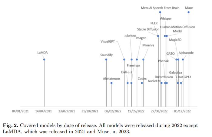 有趣的是,所有这些模型仅由 6 个公司发布,如图 3 所示。背后的主要原因是为能够估计这些模型的参数,必须拥有巨大的计算能力以及在数据科学和数据工程方面技术精湛、经验丰富的团队。因此,只有图 3 所示的公司,在收购的初创公司的努力下以及与学术界的合作,才能够成功发布生成式 AI 模型。