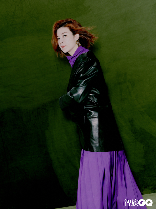 紫色衬衫、紫色半裙、黑色皮革夹克 均为Tibi