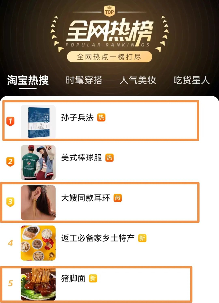 越来越多上头的“飙人”,一边用“列文虎克显微镜”盘剧集细节,一边在电商平台搜剧中“周边产品”:“高启强同款”《孙子兵法》、“强哥同款”龙骨手链、“旧街厂”猪脚面、“大嫂同款”耳环和外套,甚至有人还看中了剧里的保温杯、金蟾茶宠、瓷碗……巨大的关注度之下,《狂飙》成了新晋“带货王”。《天下网商》发现,1月29日,淘宝热搜前5位中有3个与《狂飙》相关。与此同时,对流量越来越敏感的商家也在现实经营中“一路狂飙”,快速串联热点、上线同款、引导消费,抓住这一波机会。比如被意外带火的山东强盛集团,其董事长一边强调自己公司和剧中的不是同一个,一边借着热度开始直播带货。 《孙子兵法》销量狂飙