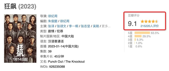 开年最火爆国产电视剧,非《狂飙》莫属。自1月14日播出以来,主演和剧情的新梗每天都能爆出两三个微博热搜。“你看《狂飙》了吗?”几乎成了现在上班族们的社交开场白,“咖啡不用冲、迟早会成功”“读孙子兵法、品强哥人生”等一系列名梗层出不穷……剧中揭露黑恶势力的大尺度与生活感饱满的细节展现,让网友惊呼“扫黑剧天花板”,话题热到想不被剧透都难。《狂飙》作为爱奇艺上播放热度最快破万的电视剧,距离大结局还有6集,豆瓣评分依然高达9.1分。对比同期热播的科幻电视剧《三体》(评分8.1)和言情剧《去有风的地方》(评分8.3),可以说,《狂飙》是目前播出电视剧中全网全年龄段认可度最高的一部。