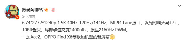 1月31日,博主数码闲聊站在微博透露接下来的一加Ace2、OPPOFindX6等欧加集团新机将会采用一块尺寸为6.74英寸的屏幕,采用MIPI4Lane接口,材质使用的是天马T7+发光材料,此外,还支持10Bit色深、1400nits局部峰值亮度以及原生2160HzPWM高频调光。