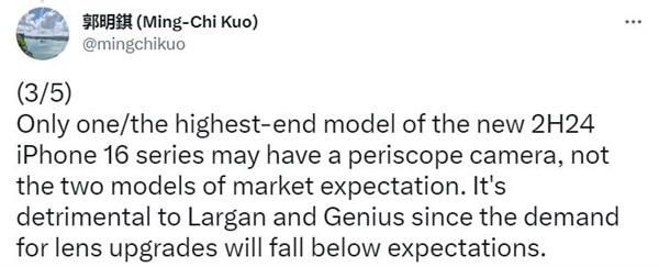 今日消息,分析师郭明錤透露,不止是iPhone 15系列顶配版本15 Ultra将独占潜望式长焦镜头,2024年的iPhone 16 Ultra也是独占潜望式长焦。
