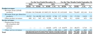 激光雷达是禾赛科技最主要的收入来源,占比9成以上。从2019年到2022年前三季度,公司收入分别为3.481亿元、 4.155亿元、7.208 亿元、7.935亿元,2022年前三季度的收入超过了2021年全年收入。从收入结构来看,激光雷达销售收入分别为3.28亿、3.46亿,6.85亿和7.27亿元人民币,在整体收入中分别占比94.2%、83.6%、95.1%和91.6%。