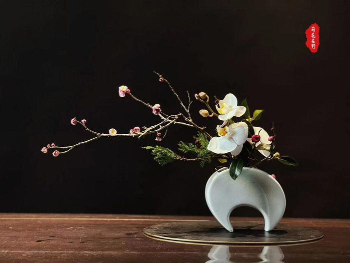 现场,李朝辉选择一个白色器皿,放好固定花材用的剑山,加水,采用传统插花的上散下聚形式,用蝴蝶兰、红梅、山茶花和松柏等四种花材,很快便创作出一个茶席花。“因为是做的茶席花,所以器皿选择了与茶杯一样的白色。风格上,器皿是国外“草月流”常用的花器,四种花材都是传统插花中最常用的花材。”