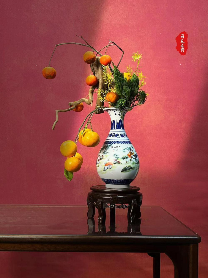 在李朝辉的手里“万物皆可插花”。装鸡蛋的塑料盒搭配郁金香,创作出《郁郁葱葱》;用桔子、松柏、枯木,创作出《吉祥如意》;用辣椒、郁金香,创作出《好彩头》……
