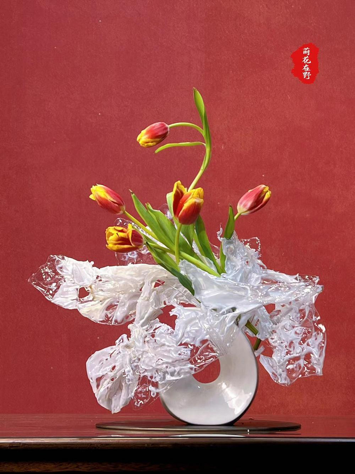“将大自然稍加修饰做成花艺,会有意想不到的效果。”李朝辉说,很多家庭都将装鸡蛋的塑料盒当成垃圾扔掉,但她将塑料盒加热变软进行造型后,再搭配郁金香创作出的《郁郁葱葱》,充满设计感、艺术感、喜庆感。