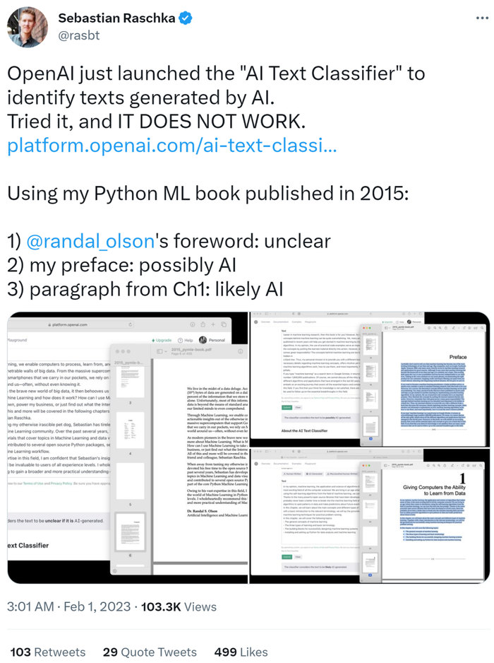 Sebastian Raschka 对此表示,这是一个有趣的例子,但自己已经为将来可能因离谱的论文识别结果而受到惩罚的学生感到难过了。