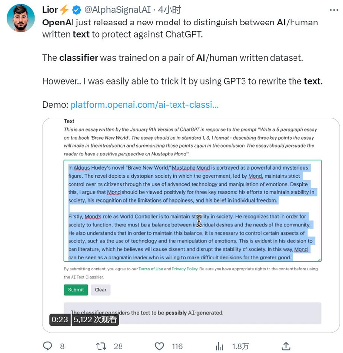 OpenAI官方推出AI生成内容识别器,但成功率只有26%,网友:还不如论文查重工具