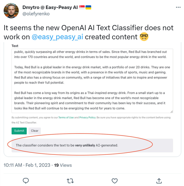 还有人上传了 AI 写作工具 Easy-Peasy.AI 创作的内容,结果 OpenAI AI 文本分类器判定为由 AI 生成的可能性非常小。