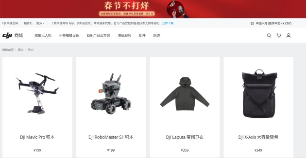 新浪数码讯 2月1日下午消息,DJI大疆在官方商城低调上线了多款周边产品,包含箱包布袋、功能服饰、云台积木、配饰挂件、精品小物等,价格从几十到百元不等,这是大疆首次对外开放周边产品系列。