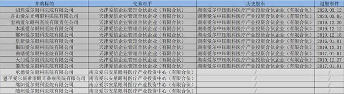 基于这一发现,我们进一步查找爱尔眼科1月3日所并购的各家标的公司的资料,在所有14家被收购的公司中,有10家出自天津爱信,而这10家公司无一例外的都是从湖南中钰接手的。由此来看,“白衣骑士”这个角色天津爱信扮演了不止一次。