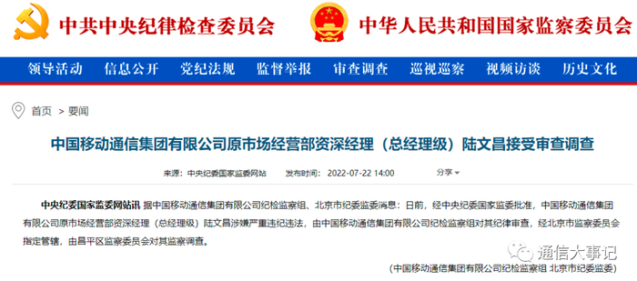 据当时中国移动通信集团有限公司纪检监察组、北京市纪委监委消息,中国移动通信集团有限公司原市场经营部资深经理(总经理级)陆文昌涉嫌严重违纪违法,由中国移动通信集团有限公司纪检监察组对其纪律审查,经北京市监察委员会指定管辖,由昌平区监察委员会对其监察调查。