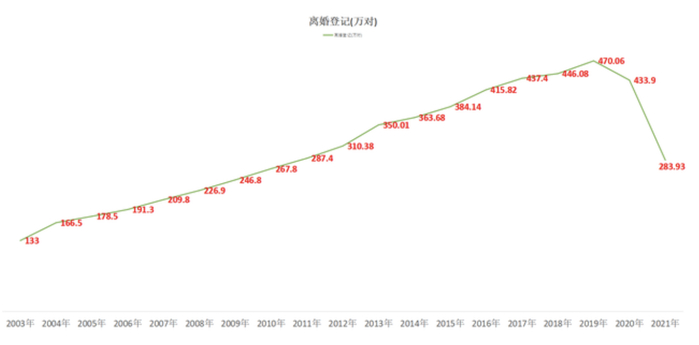 2003年至2021年全国离婚登记曲线图 据国家统计局