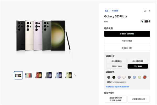 Galaxy S23 Ultra将于2月17日起上市,国行价格8GB+256GB 9499元、12GB+256GB 10199元、12GB+512GB 11199元、12GB+1TB 13199元。