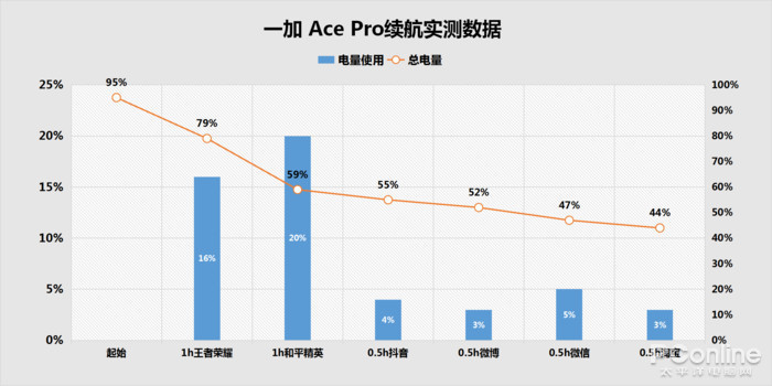 一加AcePro搭载了长寿版150W闪充,同时也将电池容量提升至了4800mAh,堪称“快充+大电池”的代表。在四小时中度续航测试中,一加AcePro的电量从95%下降至44%,共计使用了51%的电量。其中一小时王者荣耀以及一小时和平精英,分别耗费16%和20%的电量。对于长时间的重度游戏党来说,特别友好。